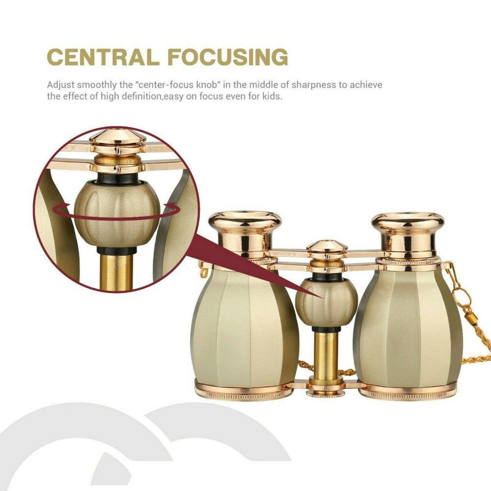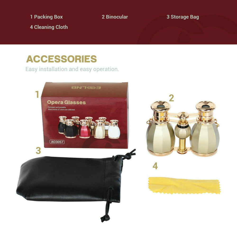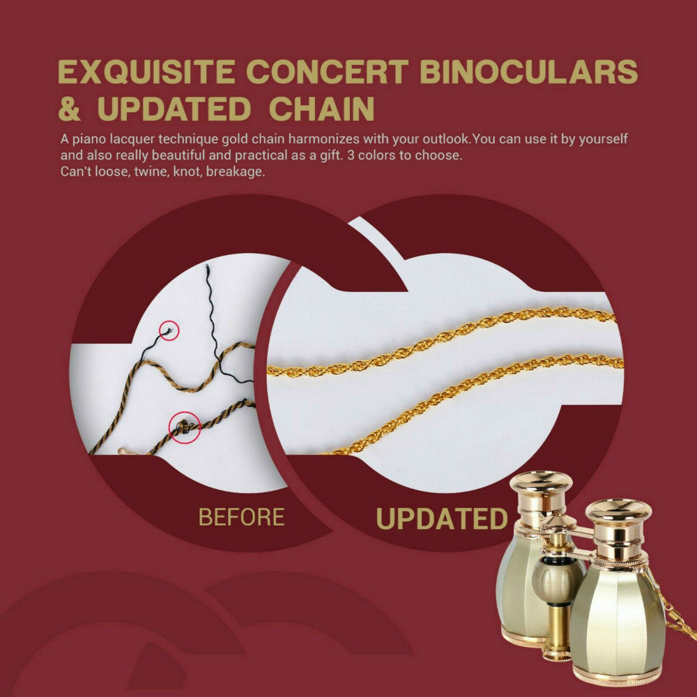 - 【Exquisite Concert Binoculars】: Compared with the old chain with black lines, ESSLNB opera glasses binoculars come with an updated delicate gold chain, which harmonises perfectly with your view. It can't get loose, twist, knot and break. This appearance is applied using a piano lacquer technique.